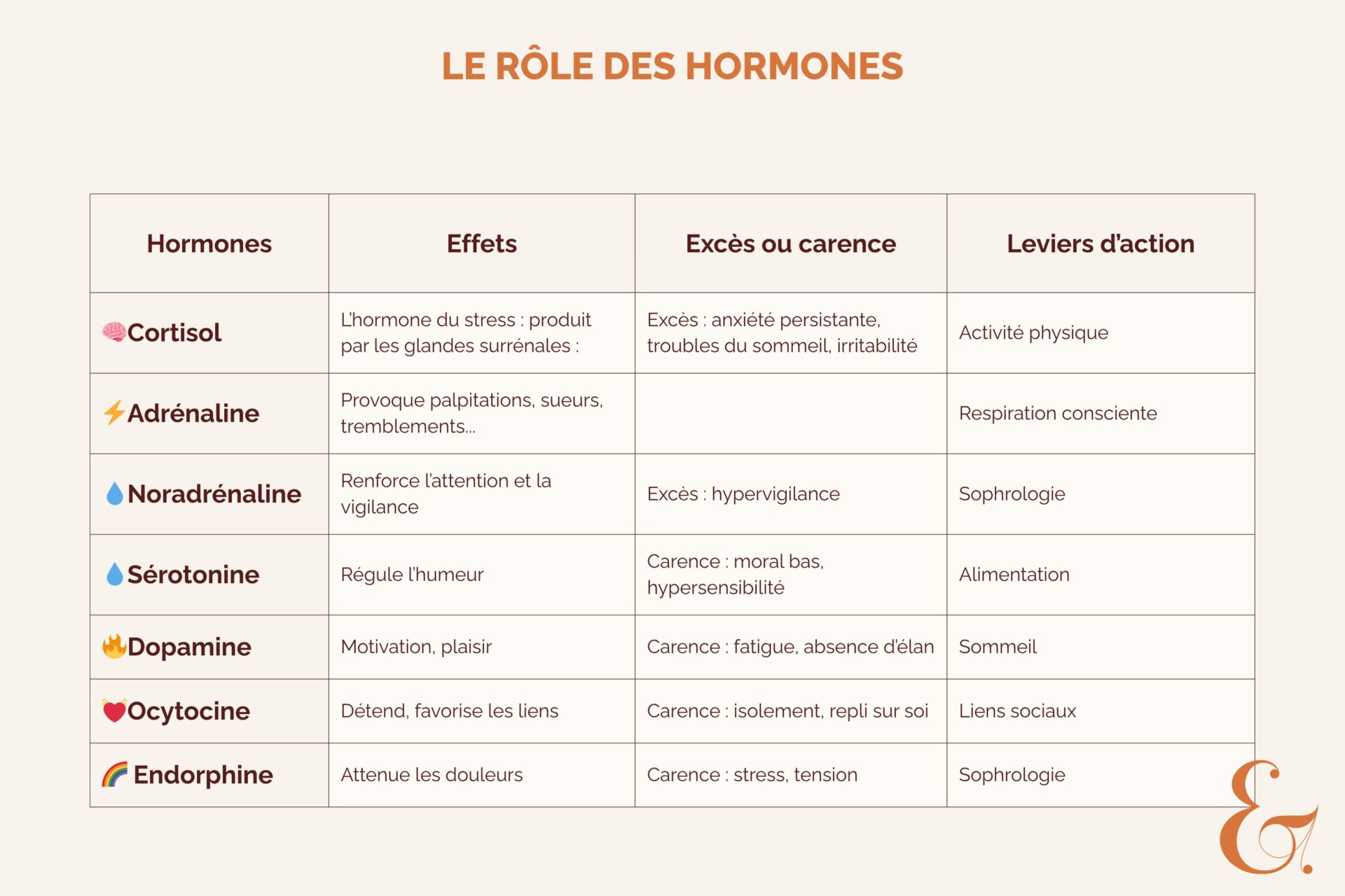 Mais ce n’est pas tout : les déséquilibres émotionnels viennent aussi d’un manque ou d’un mauvais fonctionnement de certaines hormones du bien-être.