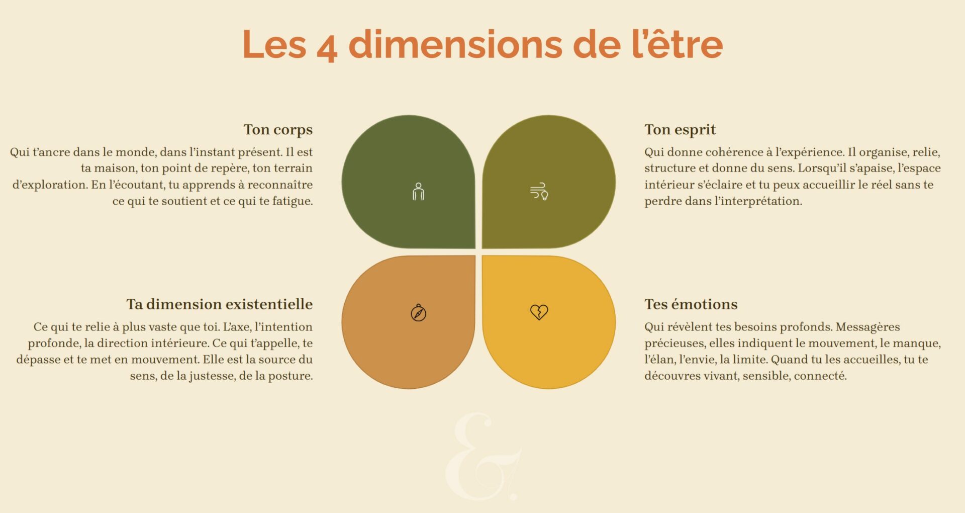 Dimension CORPORELLE : Comment j’habite mon corps. La conscience sensorielle, le schéma corporel, l’ancrage physique. Question centrale : suis-je présent à ce que je vis dans mon corps ?
