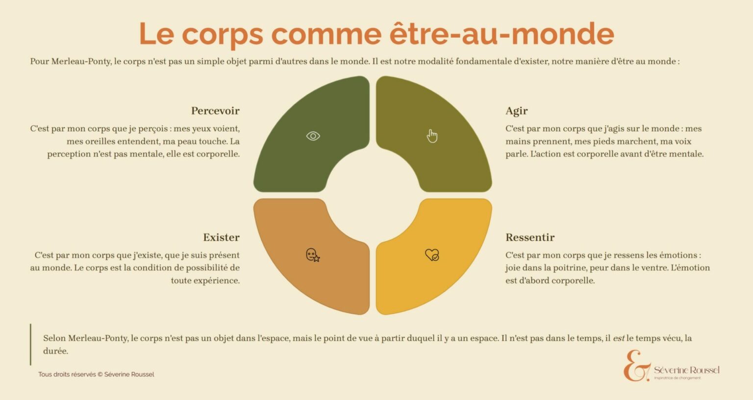 C’est le changement de paradigme au cœur de la dimension corporelle : passer d’un corps que l’on a à un corps que l’on est. La philosophe Simone de Beauvoir formulait cette distinction dans un registre différent, mais c’est exactement ce dont il s’agit. Le corps-objet est évalué, contrôlé, jugé, utilisé. Le corps-sujet est habité, écouté, expérimenté.