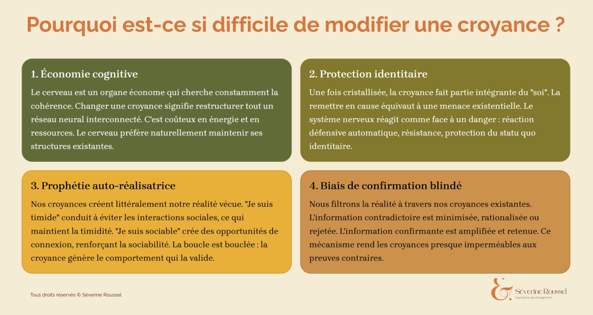 Oui, à condition de ne pas travailler que par la parole. Les croyances profondes viennent du Système 1 (émotionnel, automatique) : les convaincre avec des arguments logiques est rarement suffisant. La sophrologie travaille par le corps et la sensation, en créant des expériences intérieures qui contredisent concrètement la croyance.