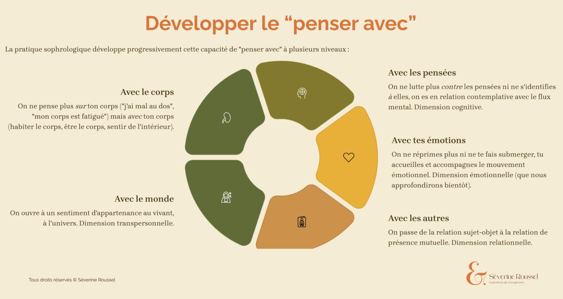 Un sophrologue qui a fait ce travail sur lui-même ne cherche pas à convaincre ses clients que leurs pensées sont fausses. Il sait, d’expérience, que la confrontation intellectuelle ne transforme pas une croyance profonde. Il sait aussi qu’il y a quelque chose de précédant la pensée, une sensation, une mémoire corporelle, une émotion sous-jacente, et c’est là qu’il va guider.